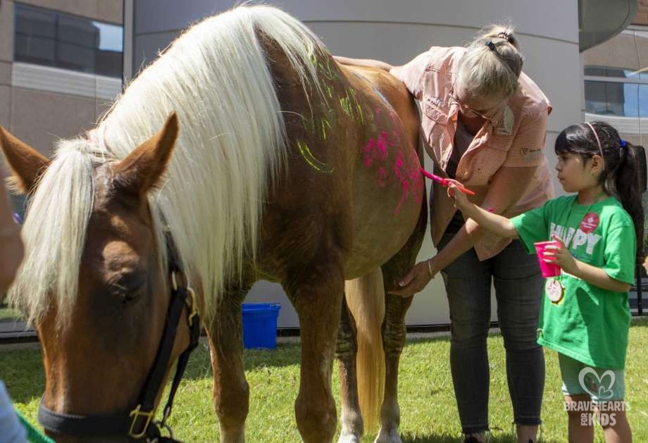Samantha Torres uses non-toxic paint to draw on the side of Stormy the horse during a Camp For All 2U event Wednesday, July 31, 2019 at Texas Children’s Hospital The Woodlands.